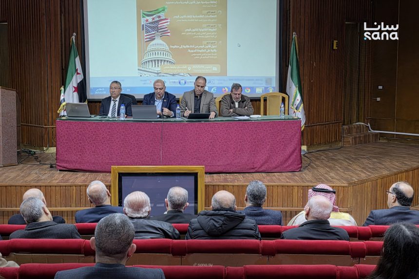 وفي تصريح لمراسل سانا، أوضح الخالد أن الندوة تهدف إلى توضيح الأبعاد القانونية والسياسية والاقتصادية للقانون، وشرح دلالات إلغائه وانعكاساته على المرحلة الانتقالية في سوريا، بما يسهم في تعزيز الوعي القانوني ودعم النقاش الأكاديمي المسؤول وتحفيز الطلبة على الحوار والمشاركة.