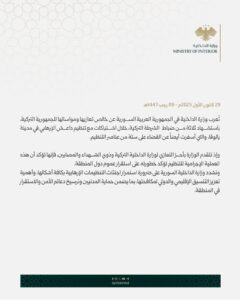 وشددت الوزارة على ضرورة استمرار اجتثاث التنظيمات الإرهابية بكل أشكالها، وأهمية تعزيز التنسيق الإقليمي والدولي لمكافحتها، بما يضمن حماية المدنيين وترسيخ دعائم الأمن والاستقرار في المنطقة.