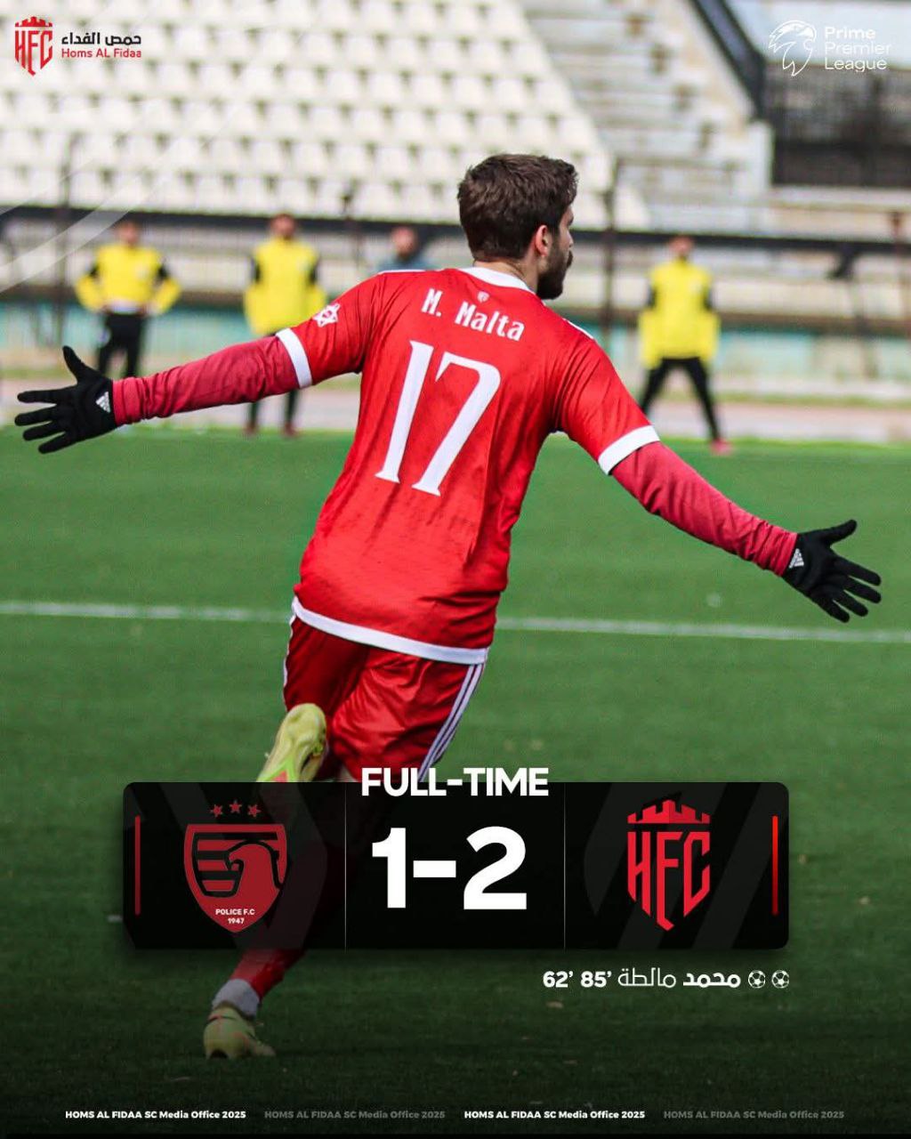 واصل فريق حمص الفداء تألقه في دوري برايم لكرة القدم، بعدما حقق فوزاً مثيراً على فريق الشرطة المركزي في الجولة الخامسة من مرحلة الذهاب، في مباراة حافلة بالإثارة والتقلبات، أقيمت على أرض ملعب الفيحاء بدمشق.