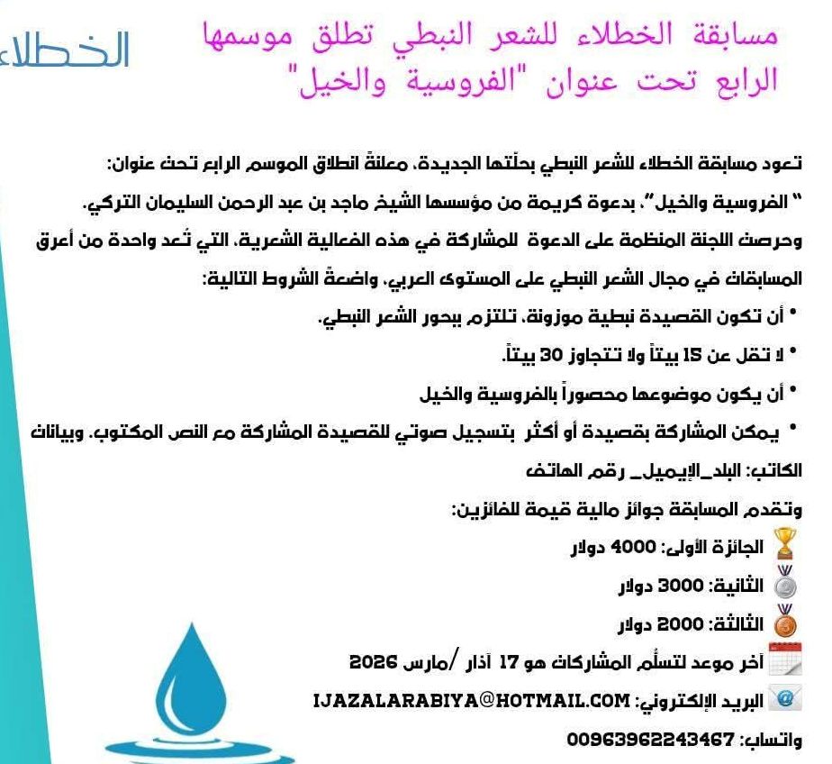 أعلن مؤسس مسابقة الخطلاء للشعر النبطي، الشيخ ماجد بن عبد الرحمن السليمان التركي، انطلاق الموسم الرابع من المسابقة، داعيًا الشعراء إلى المشاركة والتقدم بأعمالهم الشعرية، تحت شعار “الفروسية والخيل”.