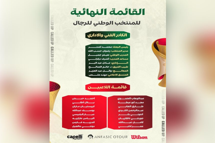 وتضم قائمة المنتخب 16 لاعباً هم: عبد الوهاب الحموي ومجد أبو عيطة وطارق الجابي وعبد الرحمن الكردي وأنتوني بكر وجورجي ناظاريان وکامل عبد الله وعمر ادلبي وأحمد حبش وبلال أطلي وكريستيان ماران ويوسف عبدالله وميار البلبيسي وإلياس عازاريه وأندريه فارس، والمجنس الأمريكي دونتي ماكجيل.