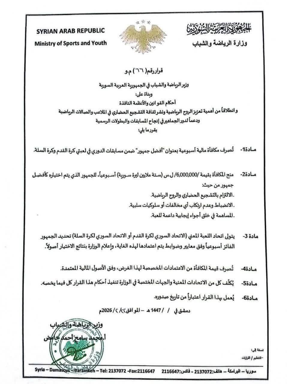 أعلن وزير الرياضة والشباب محمد سامح حامض تخصيص مكافأة مالية أسبوعية بعنوان “أفضل جمهور” ضمن مسابقات الدوري في لعبتي كرة القدم وكرة السلة، بقيمة ستة ملايين ليرة سورية، تمنح للجمهور الذي يُختار وفق معايير محددة لتعزيز الروح الرياضية والسلوك الحضاري في المدرجات.