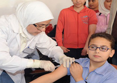 حيث بلغ عدد التلاميذ المشمولين باللقاح في محافظة حمص حوالي 78 ألف تلميذ وتلميذة موزعين على 843 مدرسة تعليم أساسي حلقة أولى .