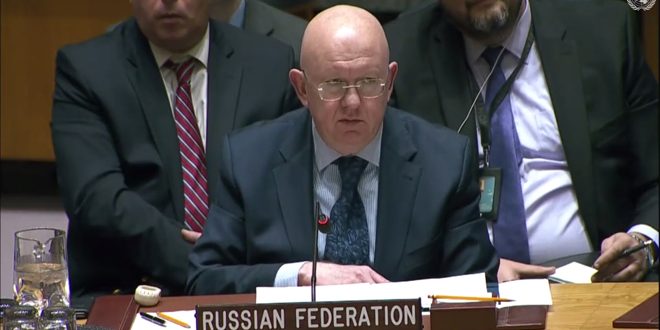 أكد مندوب روسيا الدائم لدى الأمم المتحدة فاسيلي نيبينزيا ضرورة القضاء على الإرهاب في إدلب بشكل نهائي مشدداً على أن الإجراءات الاقتصادية أحادية الجانب المفروضة على سورية تؤثر بشكل كبير على حياة مواطنيها وتعيق عملية إعادة الإعمار.