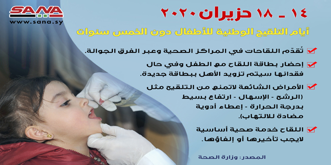 وبين مدير الرعاية الصحية الأولية في الوزارة الدكتور فادي قسيس أن الحملة تستمر حتى الـ 18 من الشهر الجاري وتم الانتهاء من الاستعدادات الفنية واللوجستية لها وتزويد المراكز الصحية بالمحافظات باللقاحات وعددها أكثر من ألف مركز إضافة لمشاركة 545 فريقاً جوالاً يقدمون اللقاح عبر عيادات متنقلة فضلا عن إحداث مراكز مؤقتة في بعض المناطق وعددها 666 مركزاً وذلك بهدف الوصول إلى جميع المناطق في سورية بما فيها مناطق وجود المسلحين.