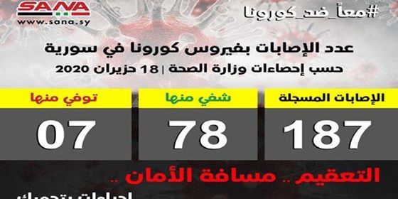 وأشارت الوزارة في بيانها إلى أن حصيلة الإصابات المسجلة بفيروس كورونا في سورية بلغت حتى اليوم 187 شفيت منها 78 إصابة وتوفيت 7 حالات.