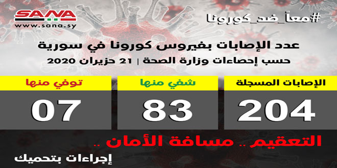 وسجلت أول إصابة بفيروس كورونا في سورية في الثاني والعشرين من آذار الماضي لشخص قادم من خارج البلاد في حين تم تسجيل أول حالة وفاة في التاسع والعشرين من الشهر ذاته.
