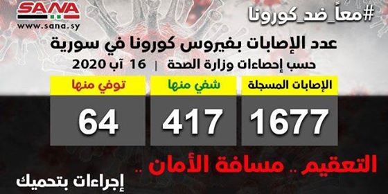 وأشارت الوزارة إلى أن حصيلة الإصابات المسجلة في سورية حتى الآن بلغت 1677 شفيت منها 417 وتوفيت 64 حالة.