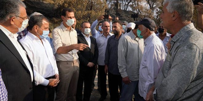 وفي النقطة الأولى من جولته التي يرافقه فيها وزيرا الإدارة المحلية والزراعة والإصلاح الزراعي ومحافظ اللاذقية ومدير الزراعة في المحافظة اطلع الرئيس الأسد على الأضرار التي تسببت بها الحرائق في قرية بلوران بريف اللاذقية واستمع الى أهالي القرية وأهم متطلباتهم لتأمين الاحتياجات الأولية التي تساعدهم في تعزيز عوامل تشبثهم بأرضهم وإعادة زراعتها بأسرع وقت ممكن.
