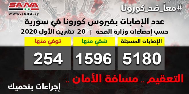 وأوضحت الوزارة أن حصيلة الإصابات المسجلة في سورية بلغت حتى الآن 5180 شفيت منها 1596 وتوفيت 254 حالة.