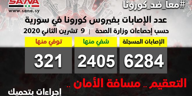 وأشارت الوزارة في بيان لها إلى أن حصيلة الإصابات المسجلة في سورية بلغت حتى الآن 6284 شفيت منها 2405 وتوفيت 321 حالة.