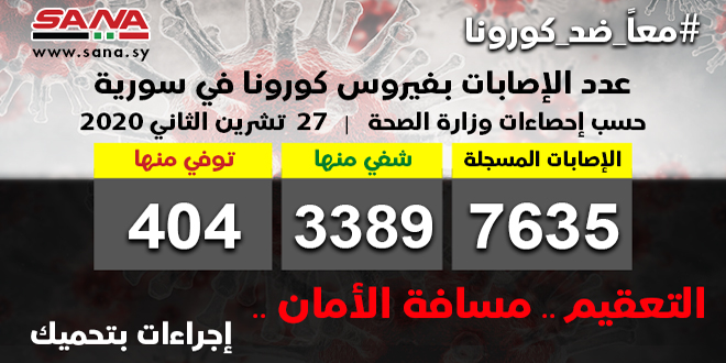 وأشارت الوزارة في بيان لها إلى أن حصيلة الإصابات المسجلة في سورية بلغت حتى الآن 7635 شفيت منها 3389 وتوفيت 404 حالات.