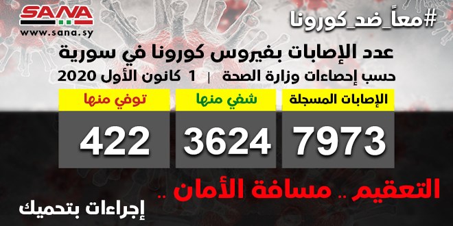 وأشارت الوزارة في بيان لها إلى أن حصيلة الإصابات المسجلة في سورية بلغت حتى الآن 7973 شفيت منها 3624 وتوفيت 422 حالة.
