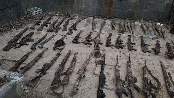 عثرت الجهات المختصة على كميات كبيرة من الأسلحة والذخائر مخبأة ضمن منزل عربي في حي الحميدية كانت تتخذه المجموعات الإرهابية مقراً لها قبل اندحارها.