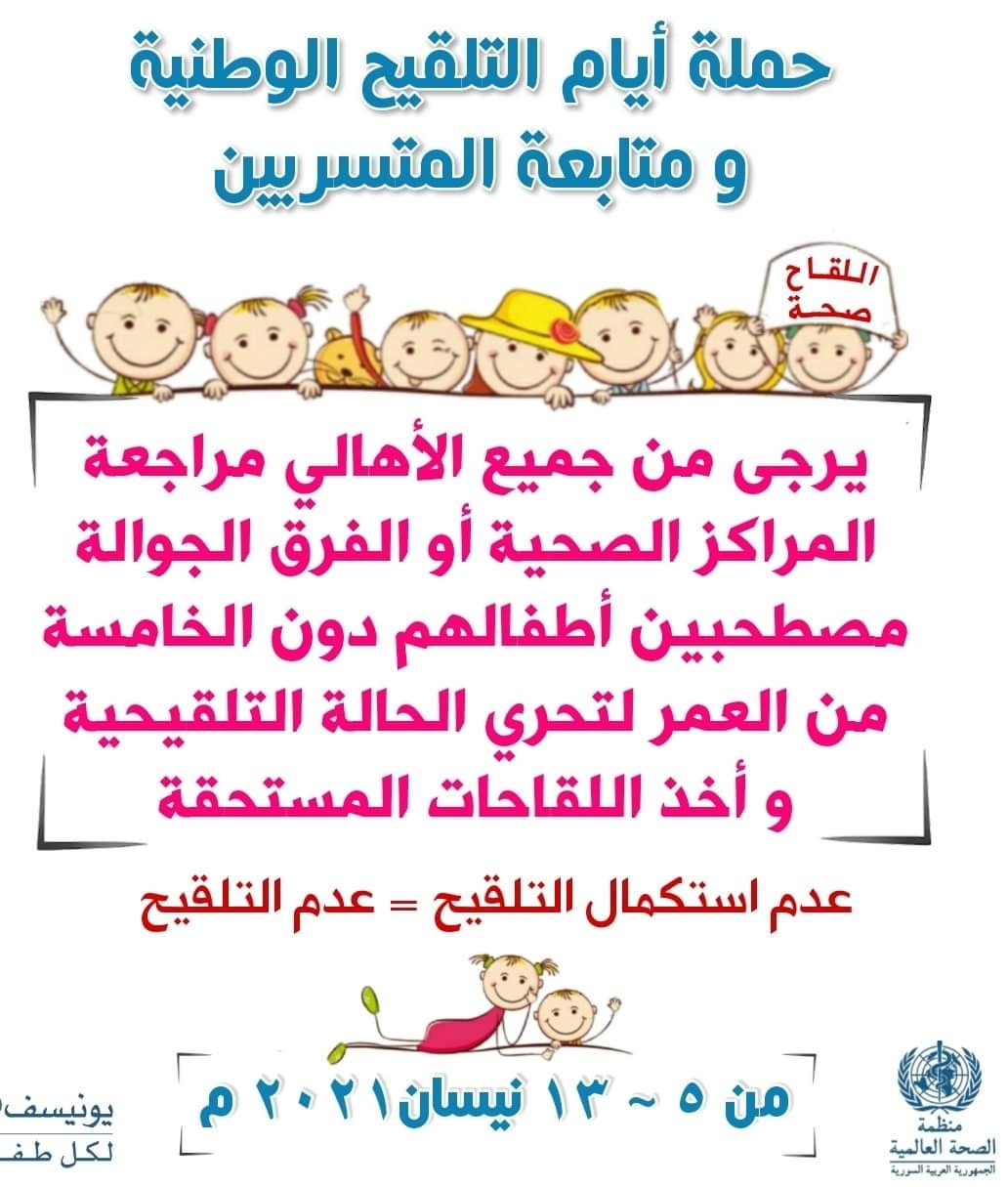 ذكر الدكتور مسلم الأتاسي مدير صحة حمص أنه من ضمن خطة وزارة الصحة – برنامج التلقيح الوطني ولرفع مناعة الأطفال دون الخمس سنوات وحمايتهم من الأمراض المشمولة باللقاح ولرفع مستوى نسب التغطية باللقاح, ستقوم مديرية الصحة بتنفيذ أيام تلقيح وطنية وحملة لمتابعة المتسربين اعتباراً من يوم الاثنين القادم 4/5 ولغاية 13/4/2021 للأطفال دون الخمس سنوات في جميع المراكز الصحية في المحافظة ,وستقوم الفرق الجوالة بتلقيح الأطفال في التجمعات السكنية الصغيرة والقرى ومراكز الإيواء متمنياً من الأهالي مراجعة المراكز الصحية لتلقيح أطفالهم , منوهاً أن اللقاحات من أجود اللقاحات لأفضل الشركات العالمية ,مشيراً إلى أن أكبر دليل على فعالية اللقاحات هو توقف ظهور الأمراض المشمولة ببرنامج التلقيح الوطني نتيجة حملات اللقاح كاشفاً أن الحملات المتكررة هي لاستكمال المناعة في أجسام أطفالنا ضد هذا المرض على دفعات مذكراً أن الأمراض الشائعة لا تمنع من التلقيح ( رشح – إسهال – ارتفاع حرارة بسيط ) أو تناول الطفل لبعض الأدوية مثل الالتهاب .