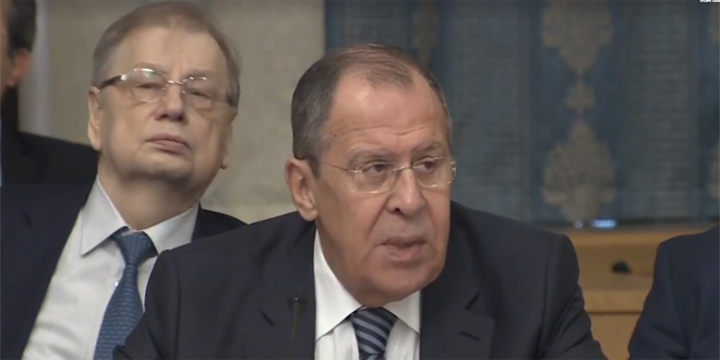 وأكد لافروف خلال مؤتمر صحفي في ختام منتدى التعاون الروسي العربي الخامس في موسكو اليوم ضرورة الحل السياسي للأزمة في سورية وفق القرار الأممي 2254 ومخرجات مؤتمر الحوار السوري في سوتشي.