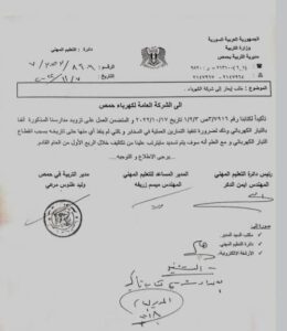 مدير التربية المساعد لشؤون التعليم المهني المهندس ميسم زريفة قال : تم مراسلة شركة كهرباء حمص بالعديد من الكتب و آخرها كتاب يتضمن بالإضافة للتأكيد على ما جاء في الكتب السابقة التعهد بتسديد المبالغ المترتبة على صيانة المحولات خلال الربع الأول من العام القادم ، مشيراً أن الأعطال طالت المحولات المغذية لثانويتي سمير محمود الصناعية بحي الأرمن ( التلمذة الصناعية ) و دلال المغربي المهنية بحي الوعر موضحاً أن المبلغ المطلوب تسديده لشركة الكهرباء يقدر بحوالي 44 مليون ليرة ، و يتم حالياً الاعتماد على تشغيل مولدة مشتركة بين المعهد و ثانوية أيهم راشد ديوب و هي ذات استطاعة عالية و يقدر استهلاكها من المازوت بحوالي 22 لتر بالساعة حيث تعمل بمعدل ساعة و نصف الساعة في اليوم بحسب كميات المازوت المتوفرة و المخصصة .
