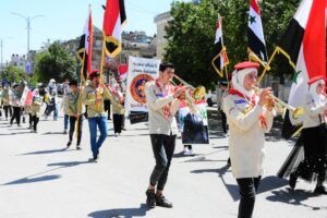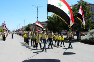 رفع المشاركون الأعلام الوطنية و صور السيد الرئيس و اللافتات التي تعبر عن سيادة سورية و عزتها و استقلال قرارها , واختتم المسير الكشفي بعزف النشيد الوطني.