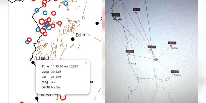 ضربت هزة أرضية بقدر 3.7 درجات على مقياس ريختر ظهر اليوم على بعد 34 كم غرب مدينة حمص.