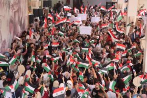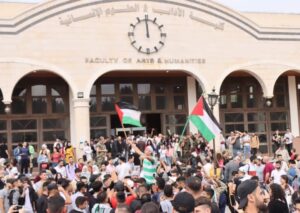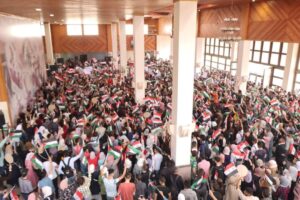 بهتافات ملأت الحناجر ردد طلبة جامعة البعث “واحد واحد واحد فلسطيني وسوري واحد … عالاقصى رايحين ..شهداء بالملايين” خلال الوقفة التضامنية التي نظمها فرع اتحاد الطلبة دعماً للمقاومة الفلسطينية وطوفان الأقصى وتأييدا لحق الشعب الفلسطيني في أرضه.