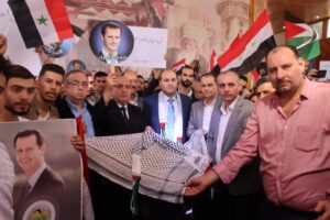 وعبر المشاركون عن تضامنهم و دعمهم للمقاومة الفلسطينية و فرحهم بالانتصارات التي تحققها على ارض فلسطين الحبيبة مؤكدين أن سورية و فلسطين شعب واحد و عدوه واحد .