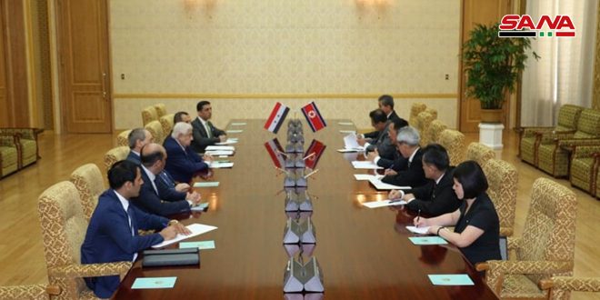 عقد نائب رئيس مجلس الوزراء وزير الخارجية والمغتربين وليد المعلم في بيونغ يانغ اليوم جلسة محادثات رسمية مع وزير خارجية كوريا الديمقراطية الشعبية ري يونغ هو جرى خلالها التأكيد على علاقات الصداقة التاريخية بين البلدين الصديقين وسبل تطويرها في المجالات كافة وخاصة في المجال الاقتصادي بما يعود بالفائدة عليهما وعلى شعبيهما الصديقين.