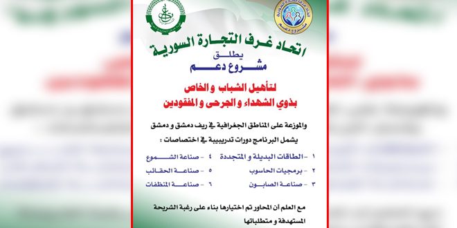 أعلن اتحاد غرف التجارة السورية إطلاق مشروع دعم لتأهيل الشباب من الجرحى وذوي الشهداء في دمشق وريفها.