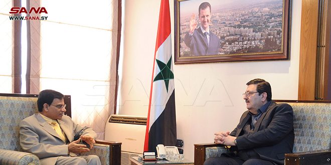 التقى وزير الإعلام الدكتور بطرس الحلاق مع سفير جمهورية الهند لدى سورية إرشاد أحمد. وبحث الوزير الحلاق مع السفير الهندي العلاقات الثنائية بين البلدين، وخاصةً في المجال الإعلامي وسبل تطويرها وتعزيزها والنهوض بها.