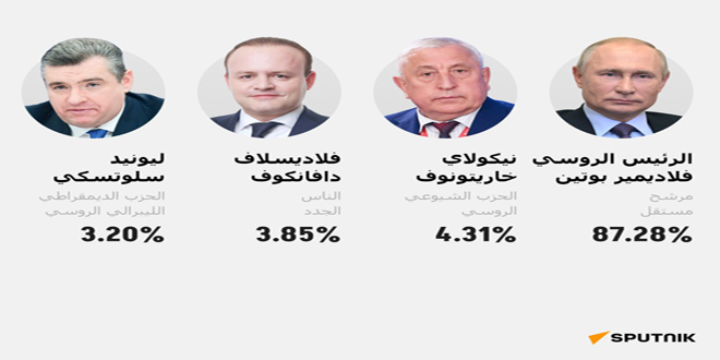 وجرت الانتخابات الرئاسية في روسيا في الفترة من الـ 15 إلى الـ 17 آذار، وبلغت نسبة المشاركة 77.44 بالمئة مسجلة رقماً قياسياً في تاريخ روسيا الحديث.